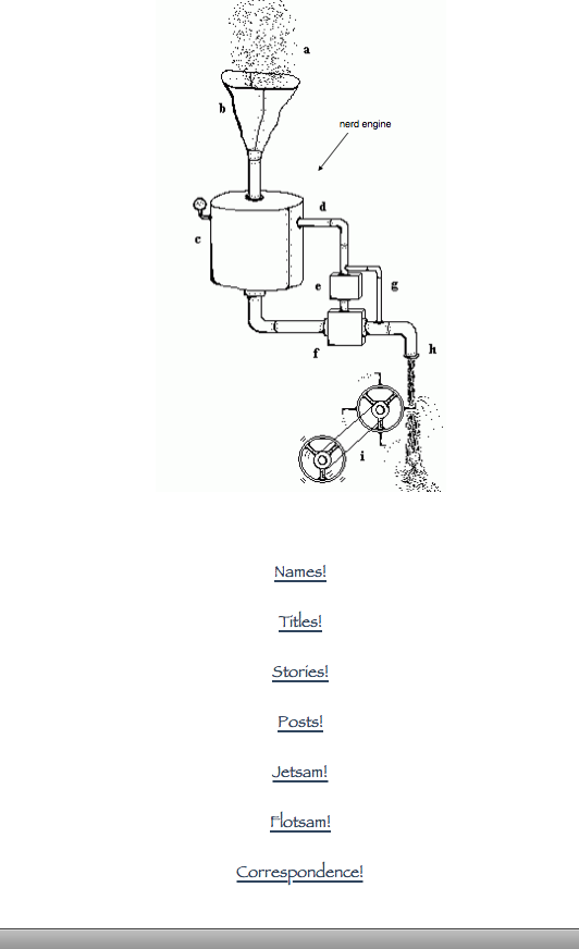 I’ve attached the home page for my VP notebook (which I called “Nerd Engine”) for reference. Each one of those underlined subjects links to a separate page. Some of those pages are just lists (like if you click on “Titles”, it takes you to a list of titles), some are pages of dates-of-entry that themselves link to new pages, those containing the writing itself. For an example of the latter, you might click on “Correspondence!”, which would throw you to a page full of dated entries like “2008 12 05 Letter To Lauren**”. Click on that one, and it takes you to the text of an email I wrote to my sister, which I’d deemed worthy of saving.