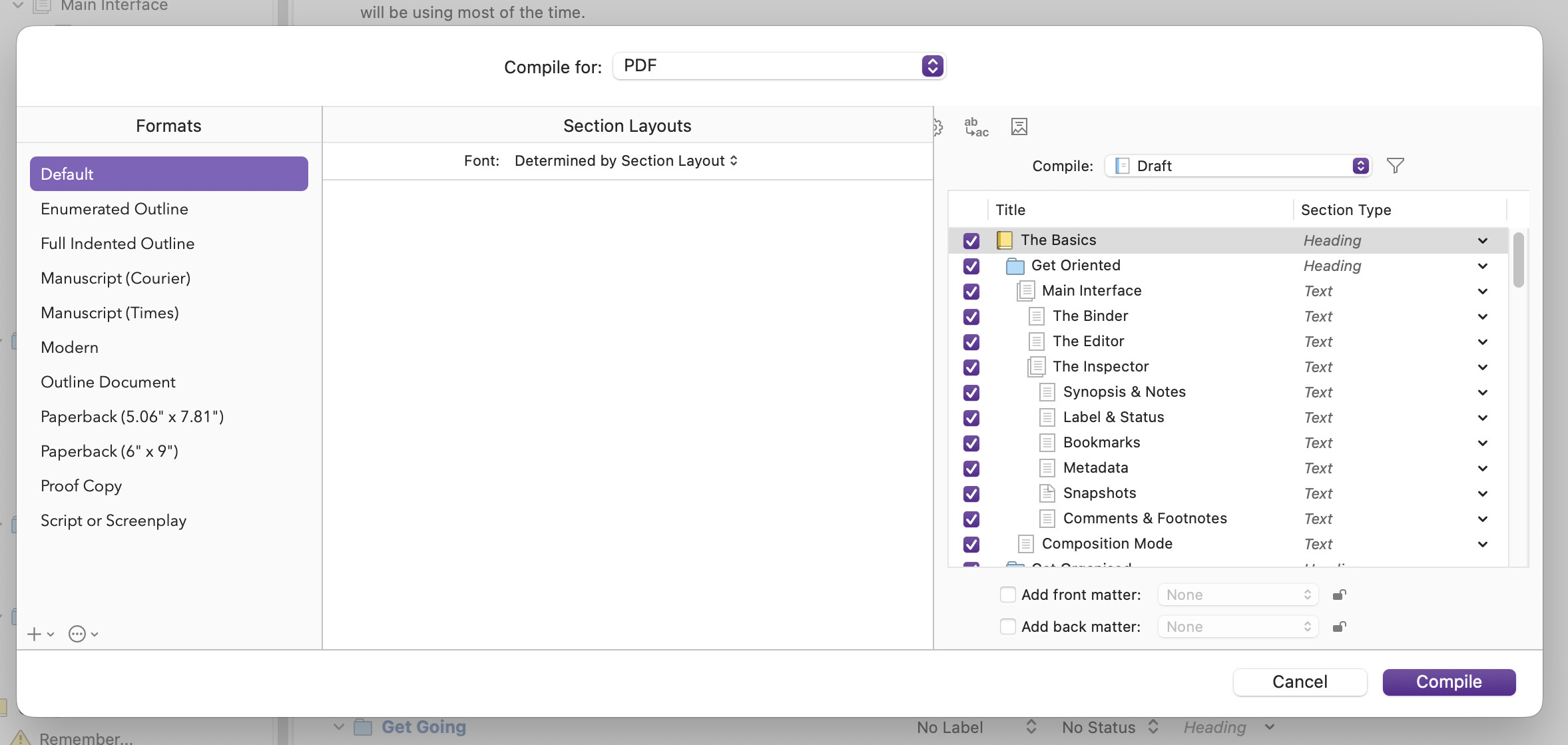 Hm, that’s strange. My build is 26.0 Beta (25A5316i). I can select the compile formats on the left and the top menu just fine, I can also toggle docs on the right side, but cannot select front or back matter and my section layouts are missing. The video shows me clicking various parts of the dialog then using [tab] to show elements that are not properly placed: