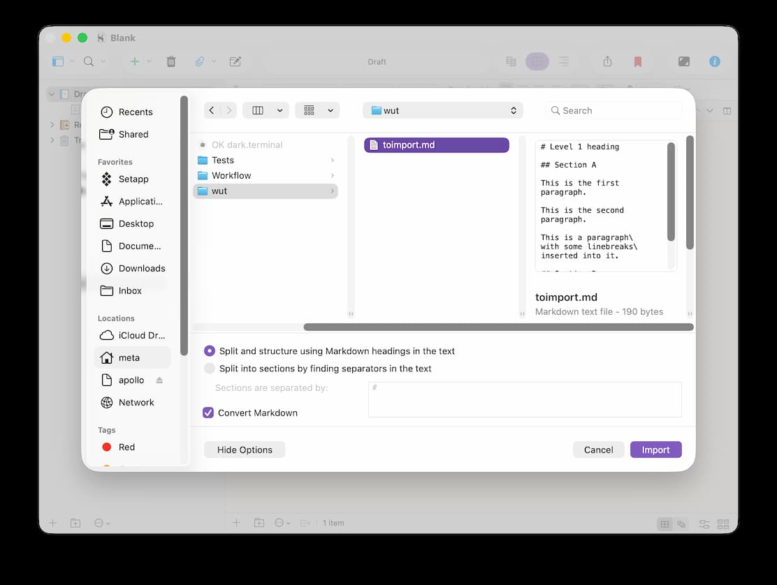 By the way, in most cases I would recommend using Pandoc or similar to create a .docx file and import & split that, using outline structure to split by (Pandoc will generate a stylesheet outline from heading structure). You’ll get better quality that way; this checkbox you’ve ticked here is not amazing. It’s okay for very simple documents, I’m sure, but if you have figures, footnotes, or anything more complex than a little italic here and there and some headings, I’d just go with Pandoc.