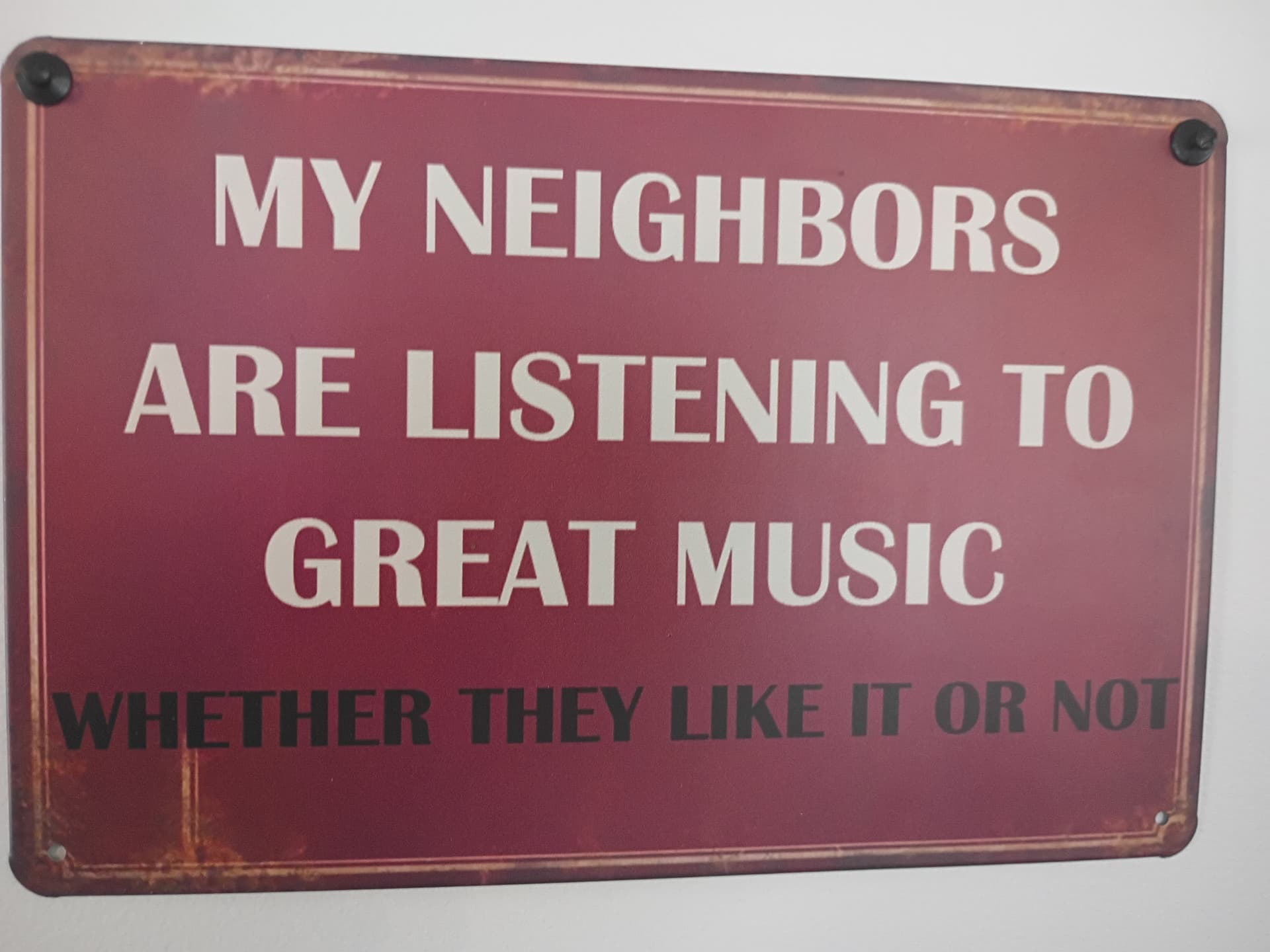 Back to the subject of the thread, my fantasy novel series is set in a musical/magical world, and I’m also composing the music for it. I sometimes will listen to some of the music I’ve composed for the novel to get me in the mood. Since I’ve composed the music, I really don’t have to play it at my piano or via the recorded version; I can just hear it in my head. Still, now and again, I will play a recorded version rather loudly through my studio speakers before writing. Here’s a sign that hangs in my studio, to remind me to wear headphones when the neighbors are home: