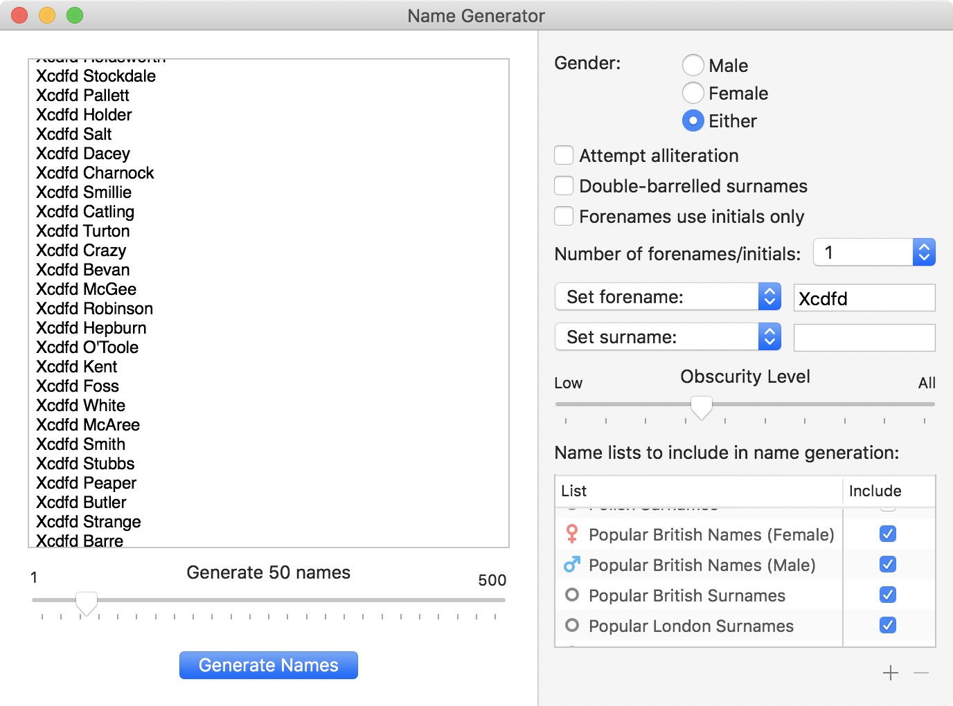Even if I set the forename with an obscure “Xcdfd”, the generator lists lots of names. Can you give an example of a name that doesn’t work?