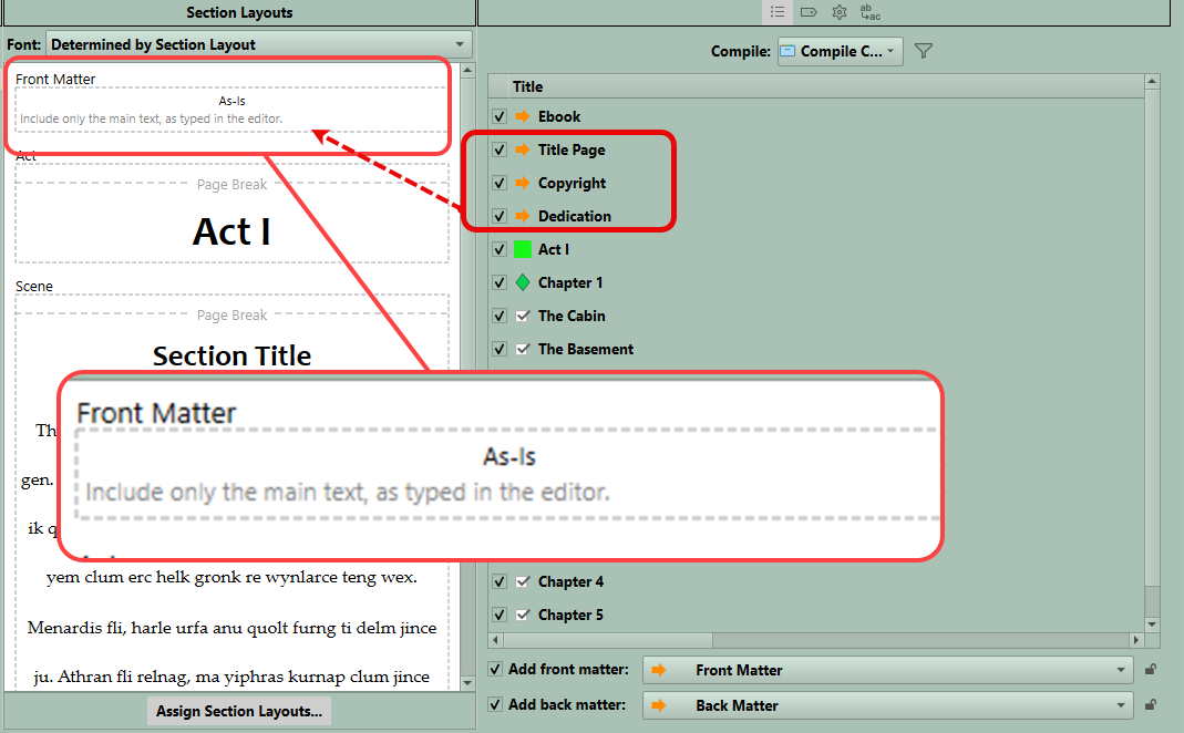 You do not need new section types for every section layout. The section layout is your formatting choice for your section type (scene, chapter, front matter, etc). Think of Section Layouts as outfits like the hat you want for the front matter, the coat you want for you chapter, and the shirt/blouse, pants, skirt, etc for your scene. Which outfit you choose will be reflected in the middle pane of the compile panel once Section Layouts have been assigned to the section types in your compile output.