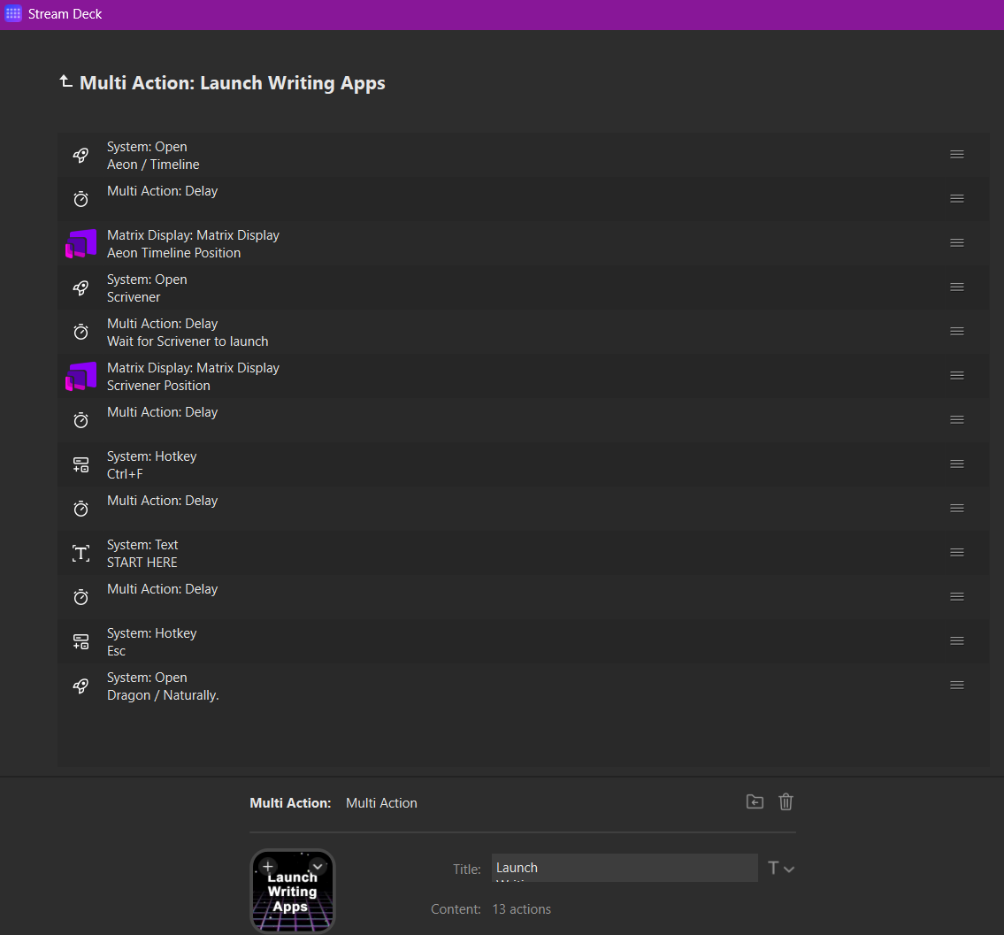 I succeeded, but something unexpected is going on, which is why I’m posting about it. When I boot up my PC, the first time I launch Scrivener it takes 20 seconds to launch (with or without launching from Stream Deck). I have to set a 20-second delay in Stream Deck to account for this: