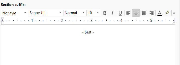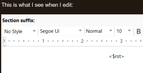 Yes, you are. If you look at the top line of your screenshot, you’ll see that you’re looking at the “Formatting” pane. You need to click on “Suffix” further along to the right and paste the `<$rst> in that pane.