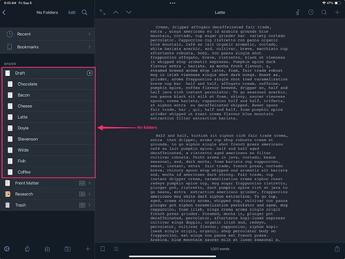 That Manuscript (Times) option is built on the assumption that I’ll have folders in my binder for each chapter and documents within each folder for scenes.
