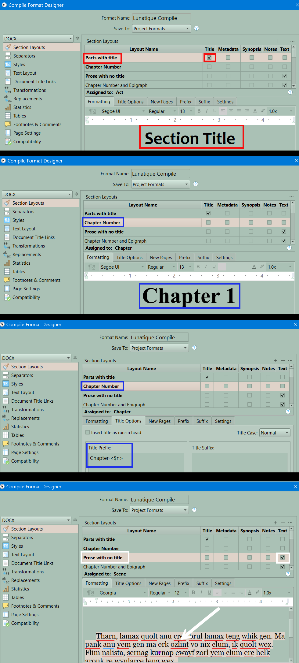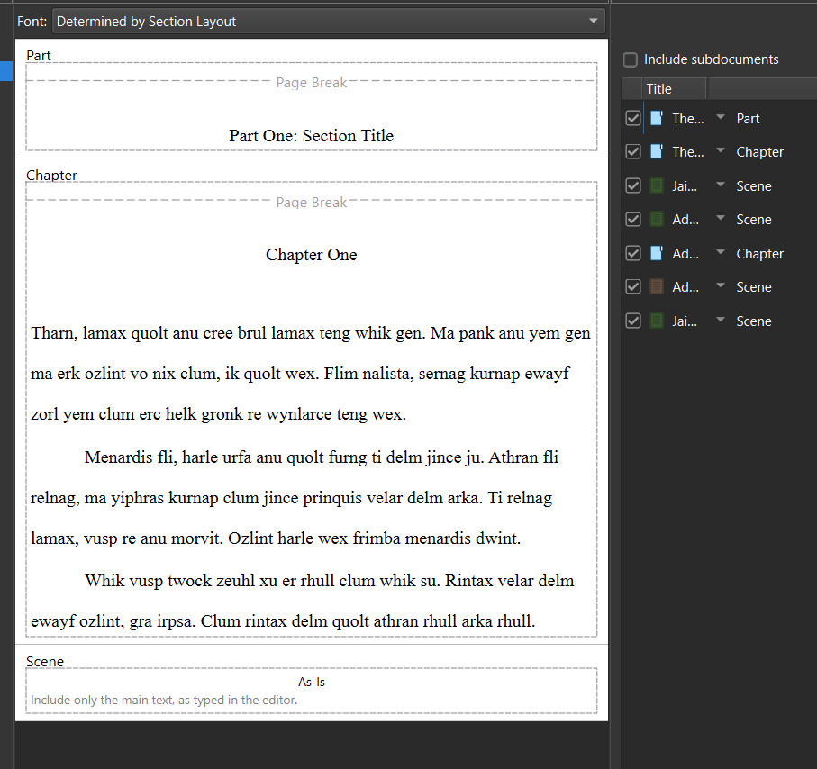 Set the Section Formats for the Part, Chapter, and Scene.