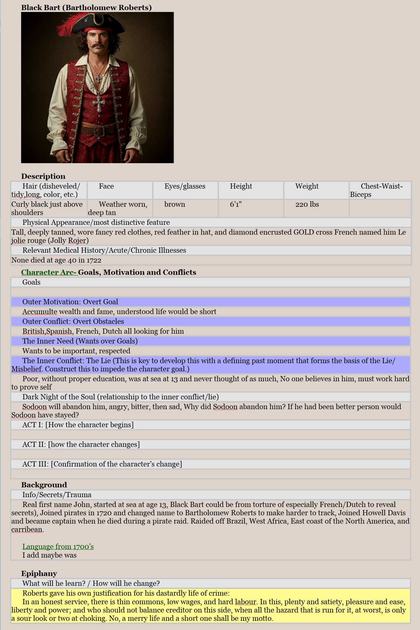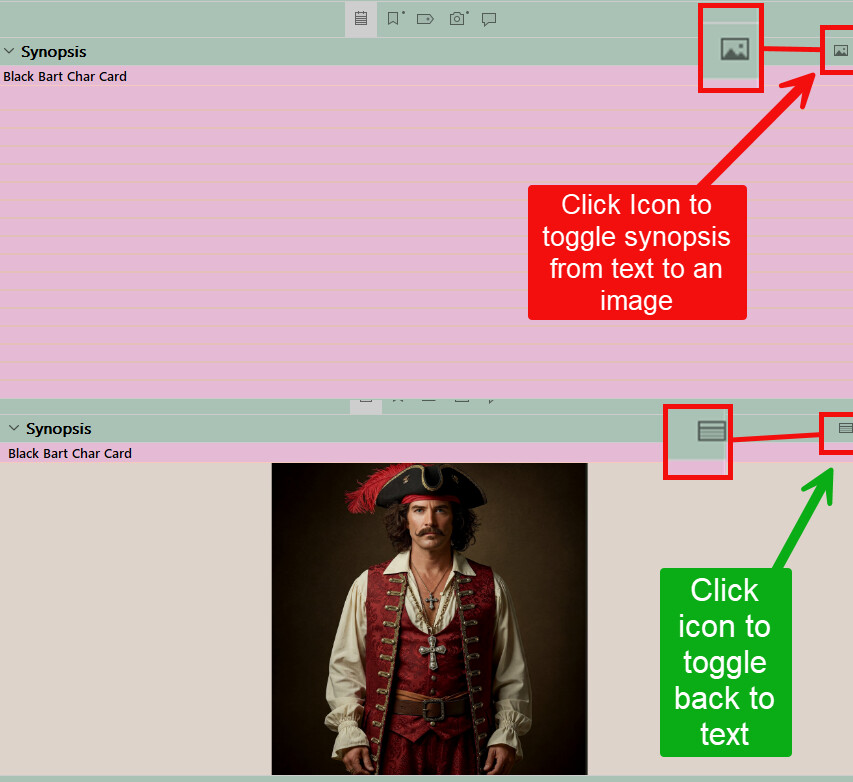 Here is an example of my character card with the picture dragged in at the top, but could easily put in the Synopsis area and switch from text to picture. So you could put the image on the character card/template or in the Synopsis area and click the icon to toggle between an image and text. See below (windows version)