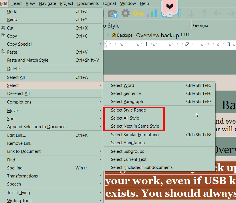 When using Edit > Select not all menu options function no matter how I select text. See the image below, the ones in the red box do not work, latest windows version, on a windows 11 pro machine. Is this a bug or am I using the tool incorrectly? It does not matter if place cursor, select no style text, or formatted text, or a paragraph style.