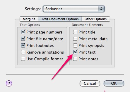 Let’s check some settings in the Page Setup sheet. These are per-project settings as well, so something might have been switched off accidentally here at some point (and any new projects will not exhibit the same error). Page Setup ([b]Shift-Cmd-P[/b]) has some basic options to look over first. Make sure your settings here are sane (i.e. you aren’t printing to a paper size that is 1” by 1” or something, and that the scale is at or reasonably around 100%). If all of that looks good, proceed to the Settings drop-down menu, and choose Scrivener. Again, make sure your margins are sane and not so large that they are obliterating all text. Next, click on the “Text Document Options” tab. Make sure you see something like this: