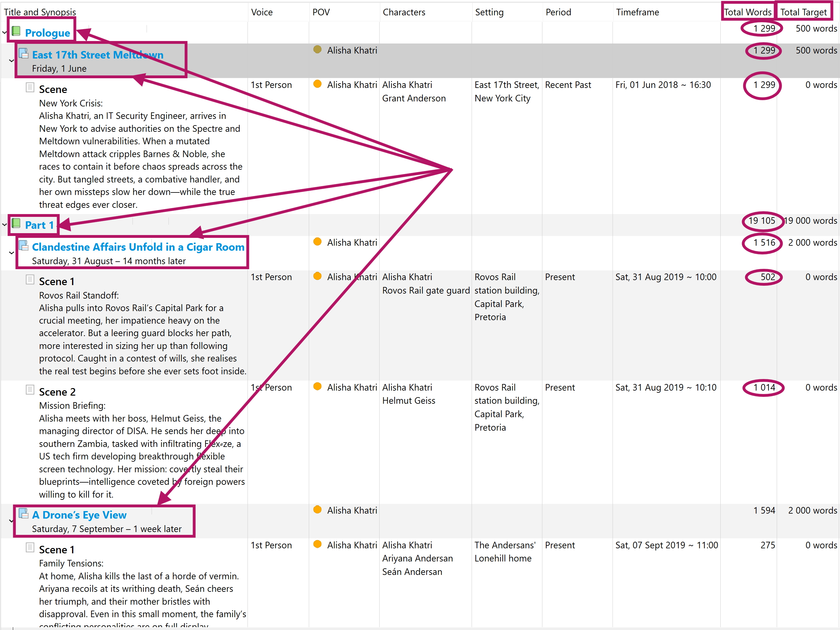 Also: there’s the option for the word number, but not the total for each folder (chapter, etc). I don’t really get why it was this number that got prioritized, and not the total. Allowing the two would make sense I think.