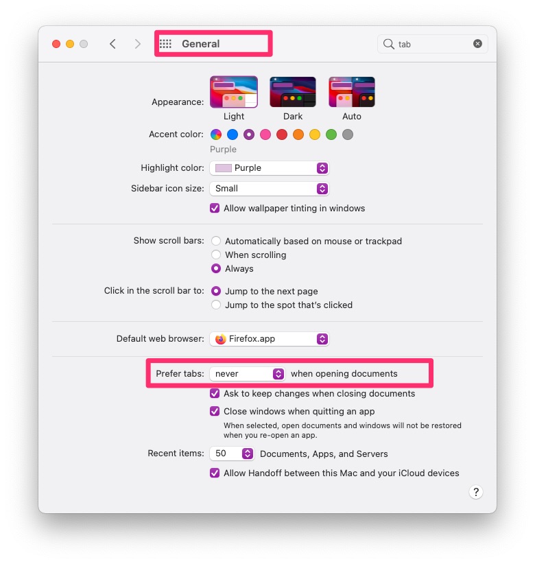 Now to prevent it from happening in the first place: This is a Mac-wide option. Open your System Preferences app, open General preferences, and change your Prefer tabs: option.