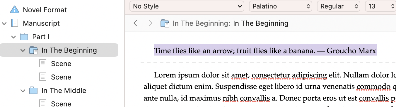 Selecting the folder, I gave it the title I want, and added the quote to the text of the folder. The lorem ipsum is the start of the scenes in that chapter.