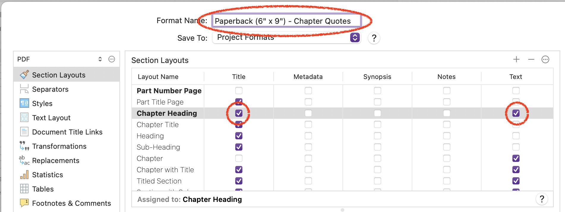 Let’s say I’m compiling for a paperback-sized PDF. Starting with the default one, I edit the layout (which makes a copy of it) and turn on the extra parts I want included in that section’s output.