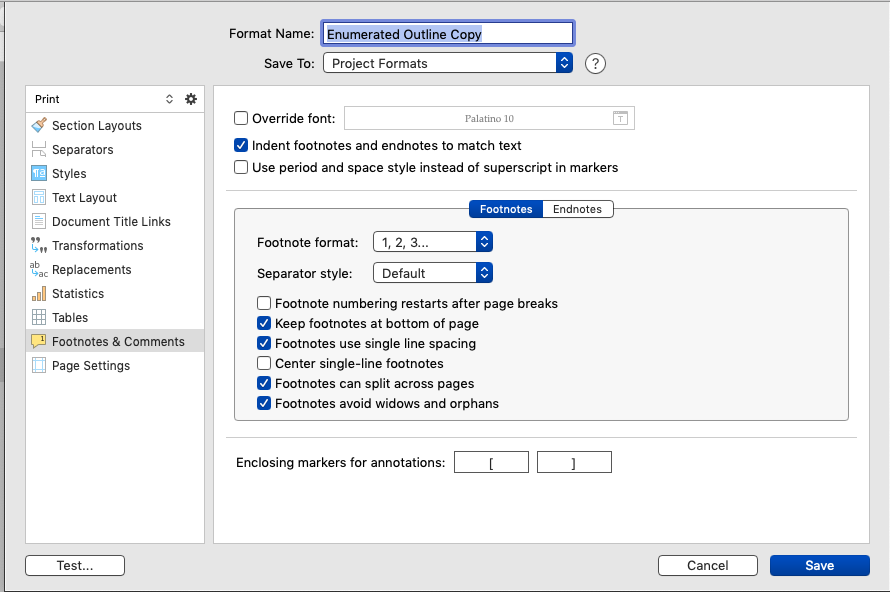 Aaaaaaand…where did the OP find format settings for footnotes and endnotes? I’ve searched every panel in Preferences, Toolbar icon > Settings, and Compile. Also did a word search through the user’s manual, but no joy.