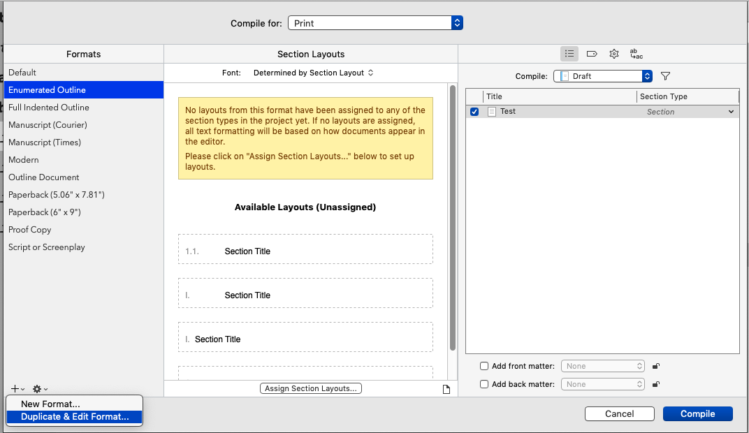 Example below after initiating Compile, choosing the Format in the left column, then clicking the + sign at the bottom of that same column. In this case, I chose to Duplicate & Edit Format for the Enumerated Outline format* which then opened to the Designer. In its left column, choose Footnotes & Comments for the footnote formatting options.