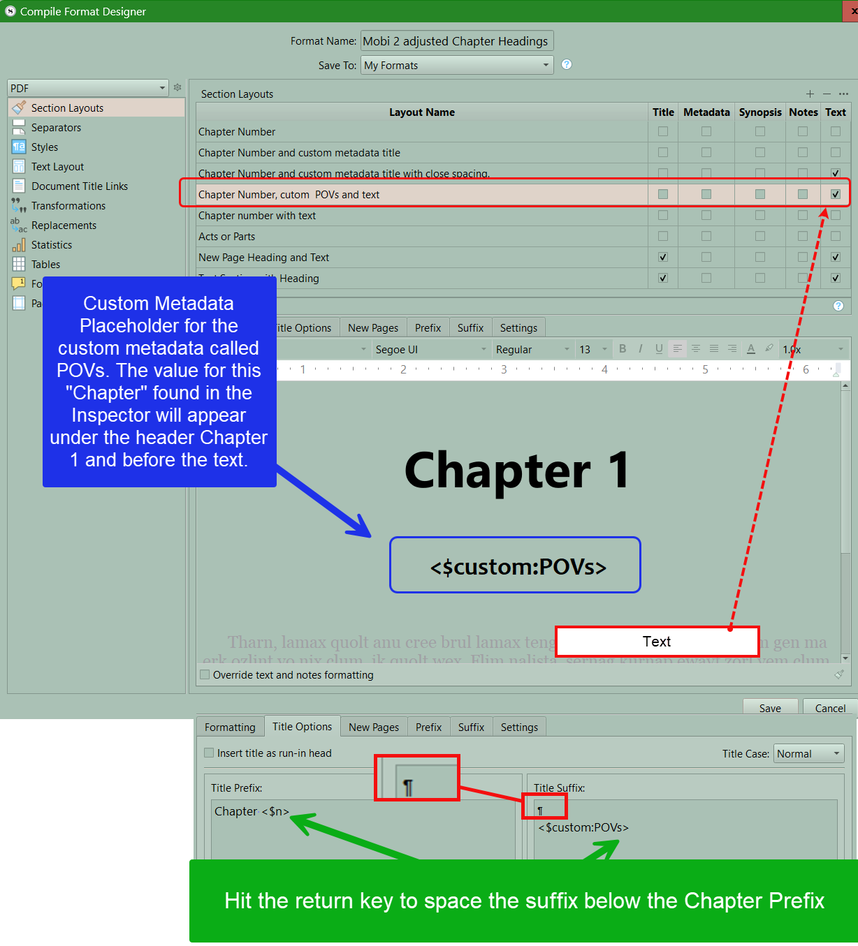 Now to get the Character name under the scene or chapter title you need to use a placeholder which will pull the Custom Metadata value for POVs into the Compile output. You must configure a Section Layout for either chapters (this example) or scenes to use a placeholder to place the Pov name when you compile. This looks like this.