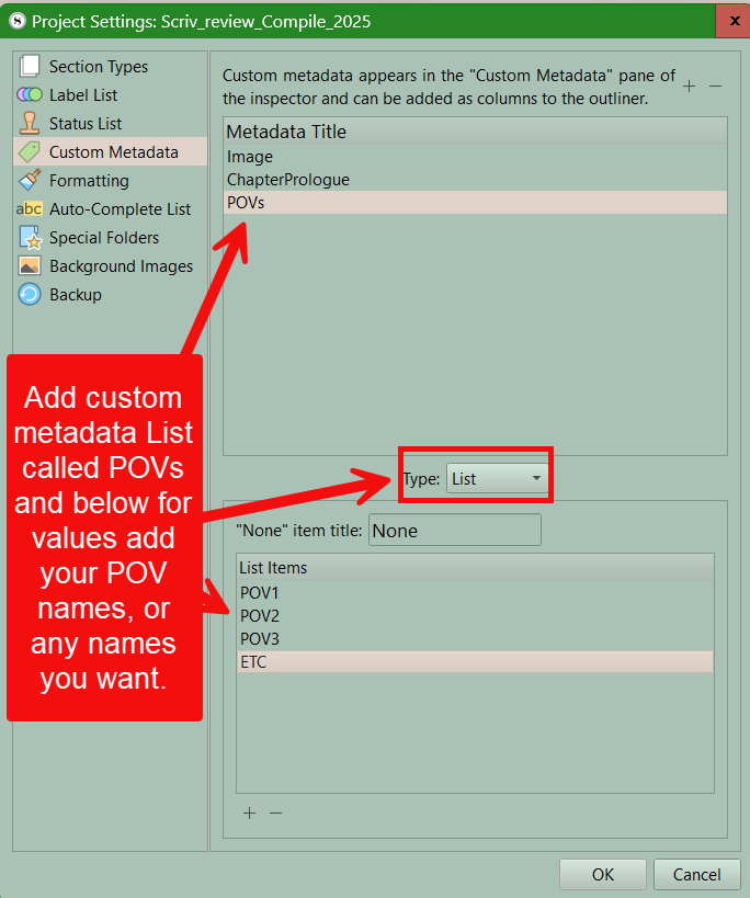 First for adding POV characters create a custom metadata list called POVs (you can make any name for this) In this list, list the characters you want in the scene or chapter.
