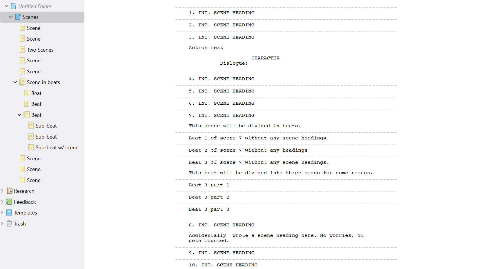 So to that end, better numbering options in the meta-writing environment definitely is something more within the scope of the software design. And it’s not just screenwriters that would benefit from that. I would love it if the user manual project could number sections the way they come out in the PDF. I know that isn’t at all easy or practical to program though. There are things we could do to make it better, and we have a list of those for consideration, so don’t give up hope on that. But don’t expect it either, what I said above remains true. In a program this flexible it is very hard to get live numbering right, not just technically, but conceptually. You can help it by structuring your work in a fashion that works with simpler numbering techniques, but that is very different from building a system that can accommodate going outside of that simple structure. I think it would be fair to say that any effort we put there would only move around that threshold of flexibility rather than abolish it.