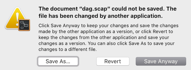 Now with both windows open, edit the .scap file using Vim, Emacs or whatever you prefer on the command-line. After saving the changes there, go back to TextEdit and try to modify and save the file, you will get this dialogue box, as you will in Scapple.