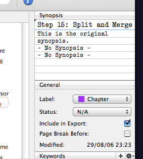Small thing: I liked the way in ScrivenerG that the information panel elements were visually indented - this seemed to me to give them a little conceptual space from the main work/writing panels. Cf the way it’s done in Aperture - and Scrivener seems to have all the potential for an Aperture For Words, or even an Aperture for Thought. is there any way of having an option for this - either a harder line around that panel, or indentation - or is that a code nightmare?