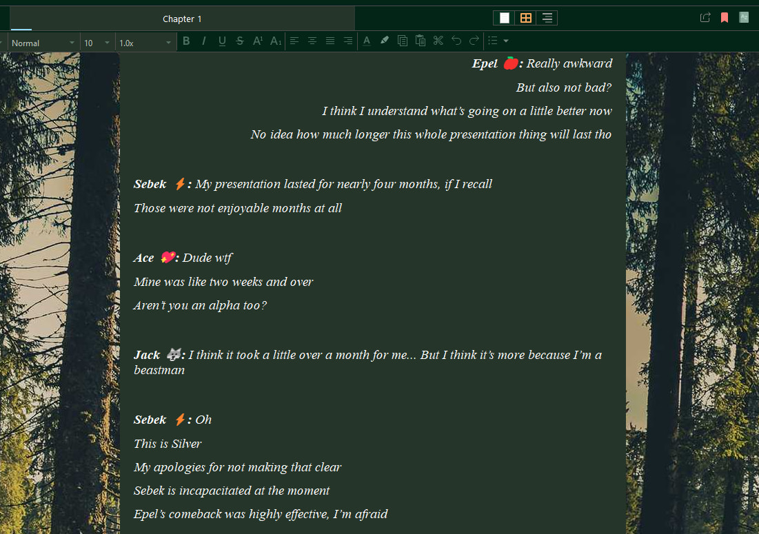 Every time there is a third style in use, that’s where the document reopens. And if there are multiple scenes like this (in this chapter there are three separate message exchanges), it always opens in the latest one. There are also around a thousand words after this passage (some of them are styled as text messages, but a good chunk is more normal text).