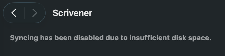 And I can assume the lack of local storage was why the save issues popped up. I don’t know if Scrivener could detect why it can’t save and show a message with that information (“Couldn’t save because project was moved” vs “Couldn’t save because of lack of storage space”). If it’s possible, it would make finding the underlying issue easier.