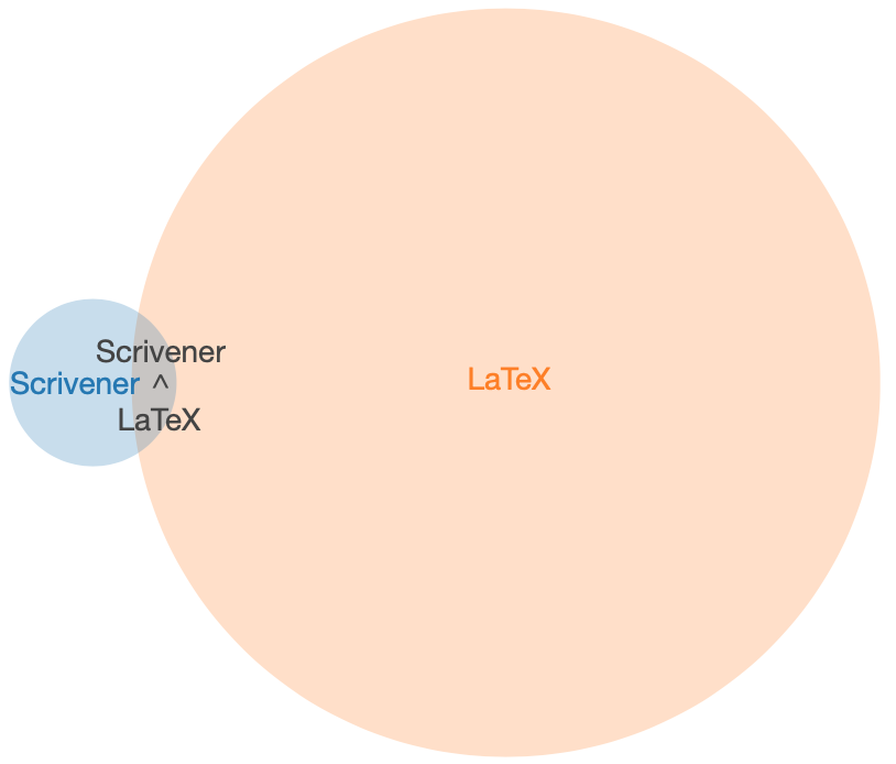 I view the intersection between Scrivener and LaTeX like the following Venn diagram to represent the functionality available in each, and how the two overlap in capability and practicality: