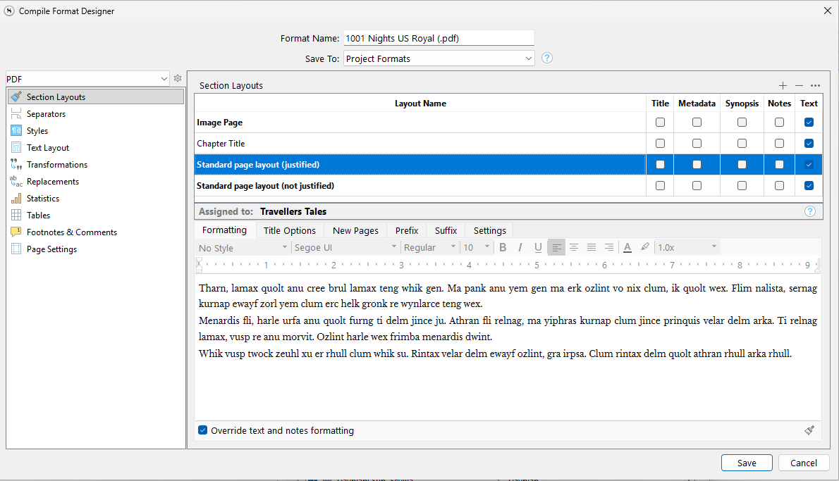 Scrivener should show the correct information for the Layout Name that is highlighted in the upper panel, and change the lower panel when a different Name is selected.