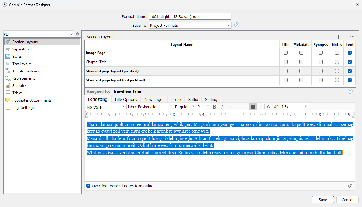 Surely the correct settings are the ones that the program uses to display the text in the second screenshot’s lower panel - in this case Libre Baskerville, Regular, 9pt, justified. Because it’s displaying the text correctly, It looks like it knows what these are.