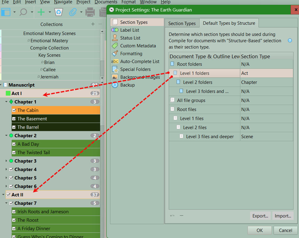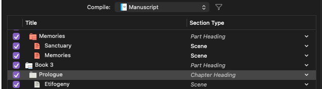 You can go to project settings and Section types and use Default type by structure to see if your section types are right. you could also do in the Outliner and check Section type as a column to view. Examples below of Acts (parts), Chapters, and Scenes.