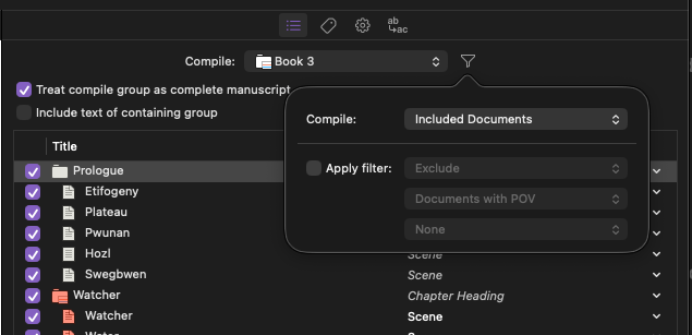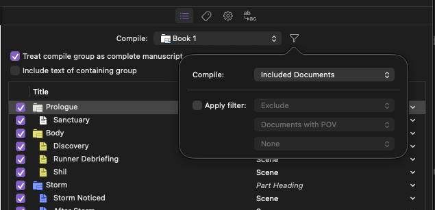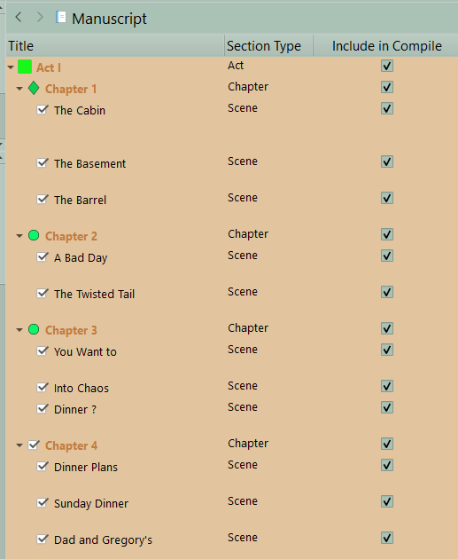 I have a project with three books in it. All three books are under ‘Manuscript’ as their own folders. They each then have chapters as folders and the chapters have the scenes. This file started off from the “Novel with Parts” template