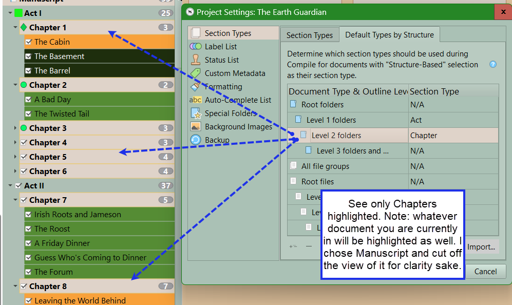 Yes, I mentioned checking the project settings in my original post. All the chapter folders are selected in the binder as expected when I select Level 2 folders.