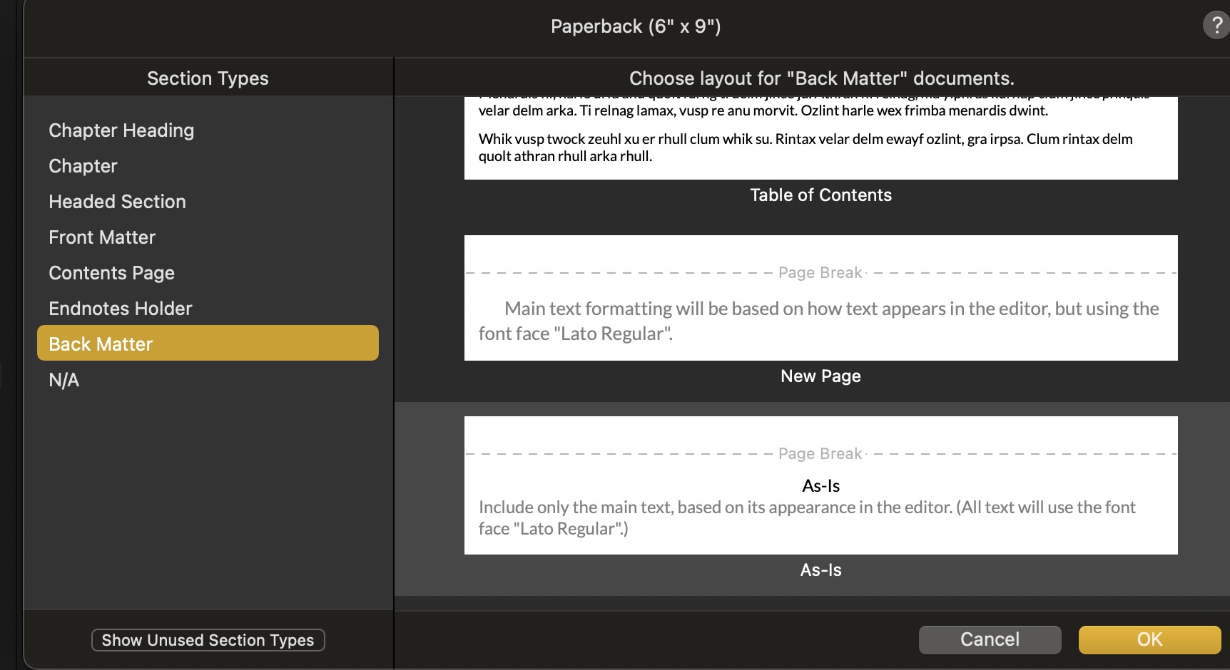 I’m just trying to do a minor tweak which seems too tricky. I’ve now selected ‘as-is’ for Front Matter and Back Matter, but it doesn’t compile ‘as-is.’ I’ve changed the font size from 14pt all the way down to 10pt, but it always compiles with the exact same something which is much larger.