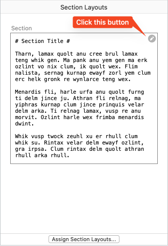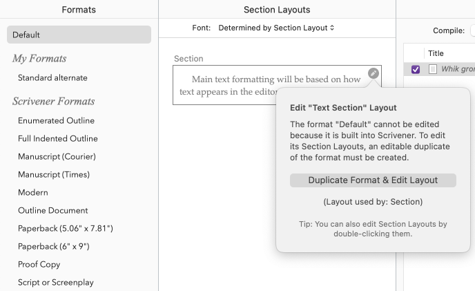 I have created a completely new project, with a single document into which I pasted some plain text. When I open the compile dialog it goes to Default, and as soon as I have my cursor arrow over the Section pane in the Section Layout column in the middle, the button appears and on clicking it the following Alert appears: