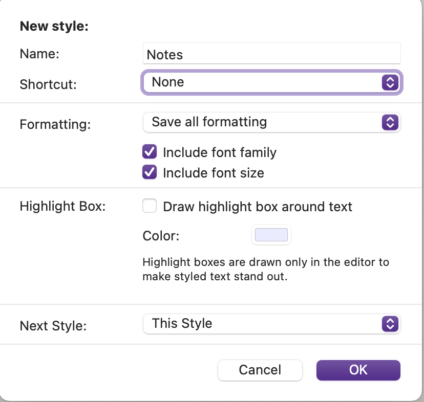 I’ve tried creating a template for notes, but find that the same thing happens, and the formatting still doesn’t stay consistent. I’ve also looked at the “Preserve formatting” function, but that seems to be about preserving formatting when scrivening everything together, and that blue box is so annoying to look at.