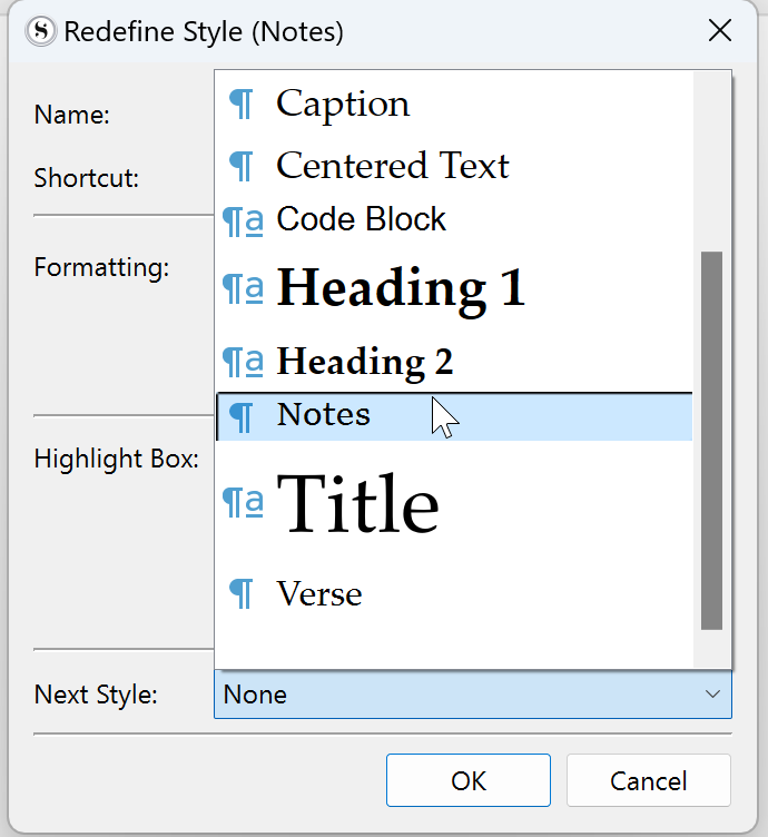 BTW, if you’re on Windows, then the list of next styles doesn’t have a ‘This Style’ option, and your new style won’t appear in the list because you haven’t pressed OK yet! No problem – all you have to do is create the style with ‘next style’ = ‘None’, but them immediately redefine it (Format > Style > Redefine [name of the style] and it now appear in the ‘next style’ list for you to choose.