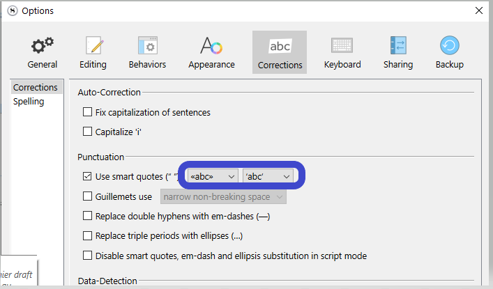 My options are different from yours, though – I don’t have options under ‘Use smart quotes’ other than the ability to turn them off and on. This has no effect on how Scrivener decides to capitalise the following word, unfortunately.