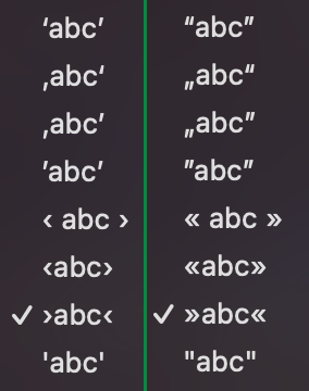 (Those are two separate menus, one containing only single quotation marks [left] and the other one only containing double quotation marks [right], with no way to pick one from the “other menu”.)