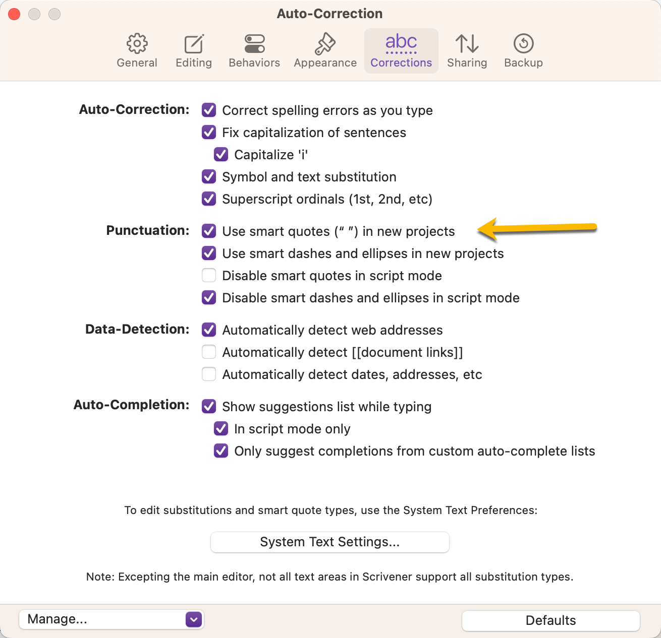I’d really like for Scrivener to handle dialogue tags a bit differently from a standard text editor, in that it should smartly refrain from capitalising words after a ?’ or a !’ and similar things.