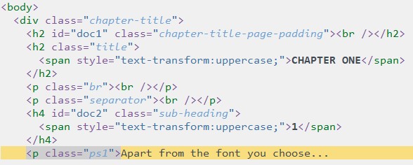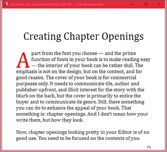 Opening the result from compiling to ePub3 in Calibre reveals the span with first-letter css-class is never added to the ePub on Compile. I’m trying to create an example of how Drop Caps would work. I’ve tried three times with the same result. It would work admirable if a span was actually generated in the output. When I insert the span with the class and add the relevant CSS to the stylesheet, the e-book shows the Drop Cap perfectly: