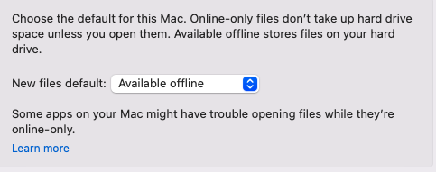 It’s worth noting that one of the main issues with Apple’s “File Provider” toolkit, which Dropbox and OneDrive must now use to provide smart sync features in 12.3+, isn’t completely stable yet, and one area in which it is weak is in downloading stuff when software asks for it—hence the workaround described in the above article, which forces the whole project to download. The way it should work is if you click on something in the binder and it needs to load some files that aren’t there, like the synopsis card, inspector notes or even the main text, then it would download them. But this doesn’t work well, so you can’t trust it to do that.