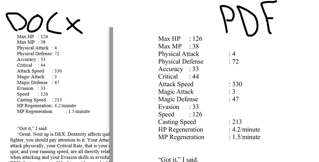I was thus advised to start using single tabs and adding them on the ruler. I did try using them, and even though everything looks perfect in the tool, the issue is still not fixed for docx and now it is broken for PDF as well: