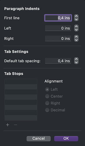 That’s a separate issue, because 0.4 isn’t one of Scrivener’s favorite indents, apparently. A series of indents 0.25" apart probably works for a lot of people.