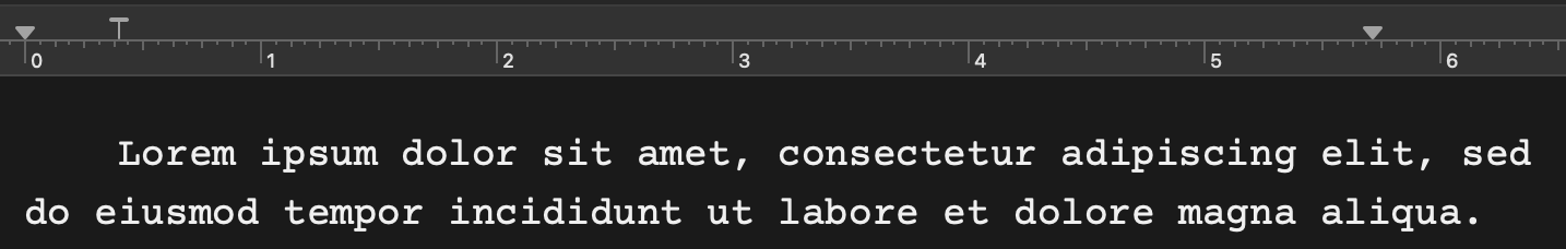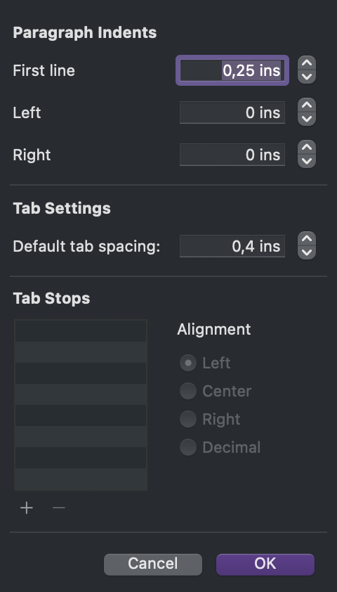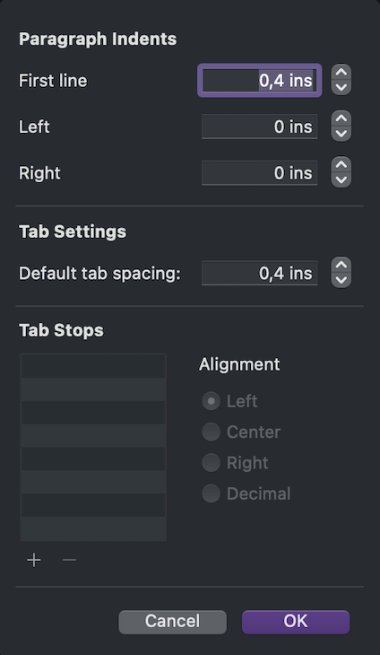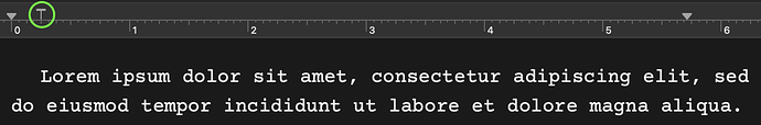 […]The amount of increment used depends on the unit of measurement set in the Editing: Options preference pane (subsection B.3.1), with the Ruler Units setting. All methods will adjust indentation in increments of 0.5cm; 0.25in; 1.5 picas and 18 points, relative to any existing indent settings on the paragraph.