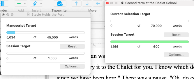 Hi, I’ve got a question about the pop-out panel. Over the last three months I have created two .scriv files, but the pop-out panel [the one that you get when you click on the green target on the toolbar] on the two is different, see screenshot below. Why does the one on the left say Manuscript Target while the one on the right says Current Selection Target?
