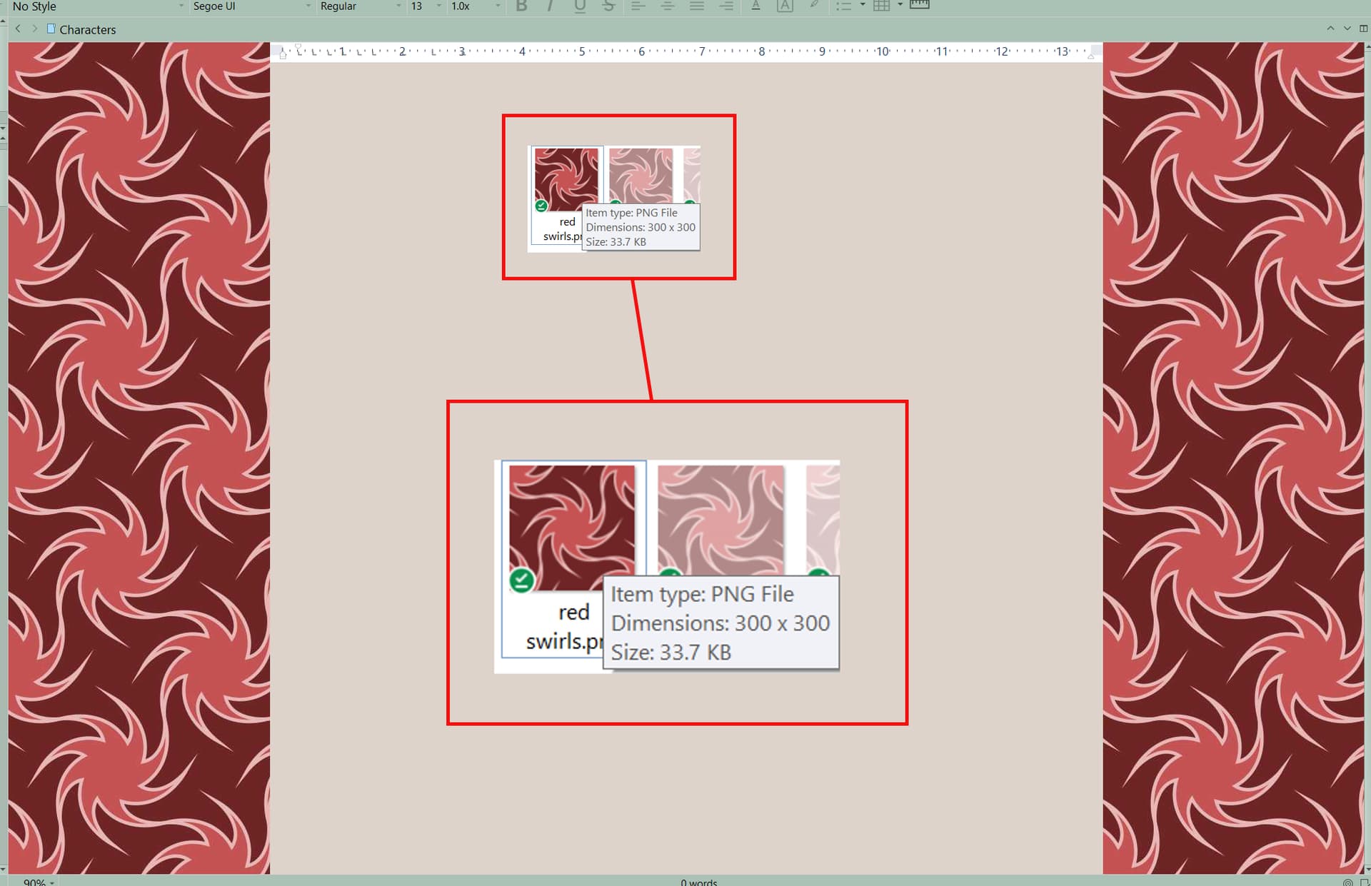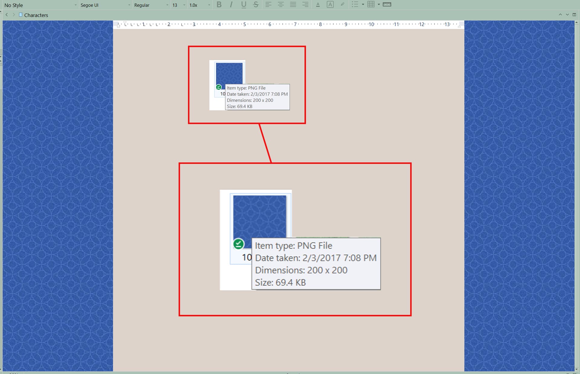 This is 640x640 png-24! And side by side screenshots of the same image in main editor vs corkboard. It’s the same for me that the position of the image doesn’t change, but when I toggle back and forth between main editor and corkboard, I can physically see the pattern degrading