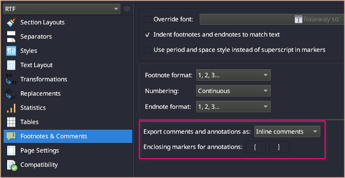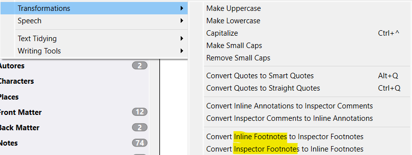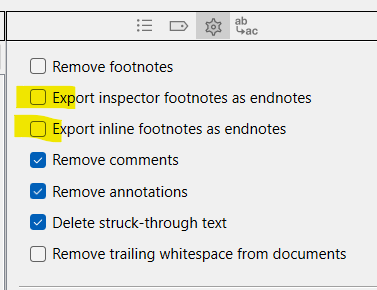 So, if you check that dropdown menu I’ve highlighted, you’ll find one of the options for inline annotations or comments is to indeed convert them to footnotes (or endnotes). So really, annotations & comments are the best tool to use all around if you don’t know for sure what you’ll eventually need them for.