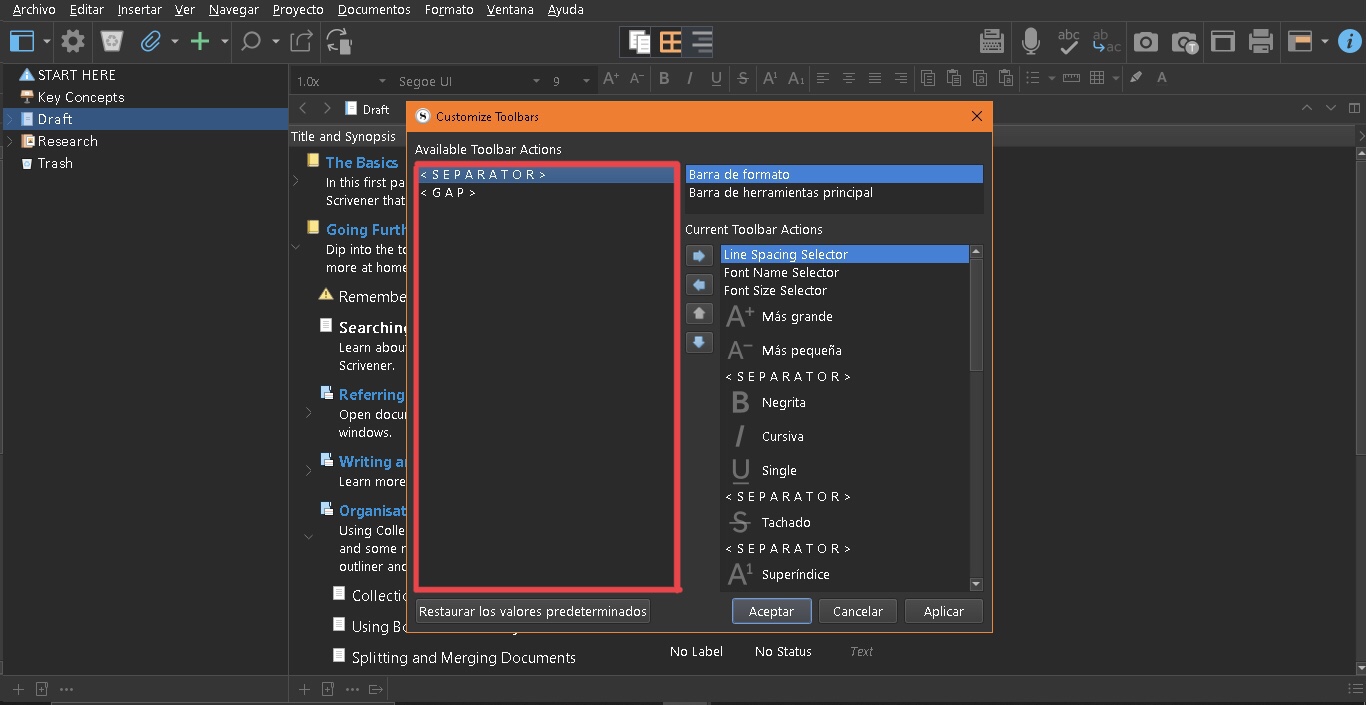 I have the latest version of Scrivener for windows. I was personilizing everything, but when I changed to dark mode, changed the language and restarted the program (so both would be on) I noticed some of the “actions” on the format toolbar and the main toolbar went missing. I tried to customise the toolbars again, it gave me no problem with the main toolbar but as for the format toolbar, below the title “Available toolbar actions”, only 2 actions appear: the SEPARATOR and the GAP, nothing else. I have no more options to move to the other column (“current toolbar actions”) and put it in the toolbar.