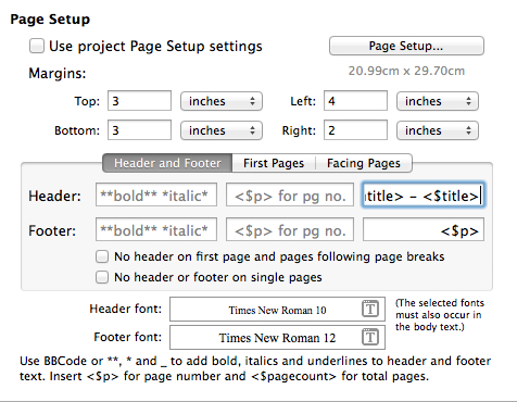 When I compile my draft, however, the header displays “<$title>” just like that, instead of the title of each document. For a little while it instead grabbed the title of the first document and printed that on every page, even after the contents had long moved on from that document, though I can’t reproduce that now. Italics and underlining work as they should, so <$title>