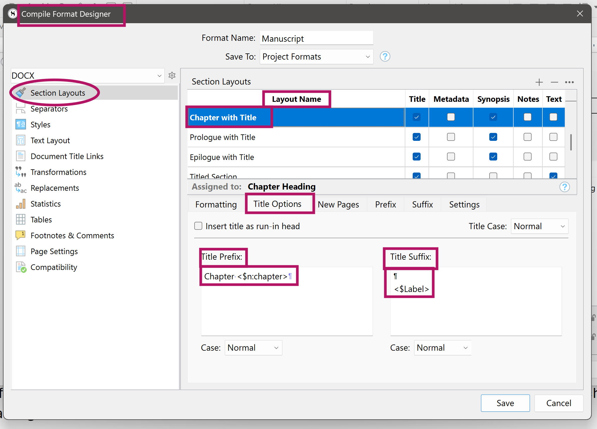 The thing is, for compiling, you choose what to include or leave out for Chapter, Epitaph and Scene, as each is a unique Section Type associated with a Section Layout that you’d customise.